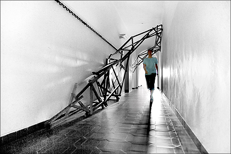 die schlangenartige Holz- Konstruktion das Gebäude durchs